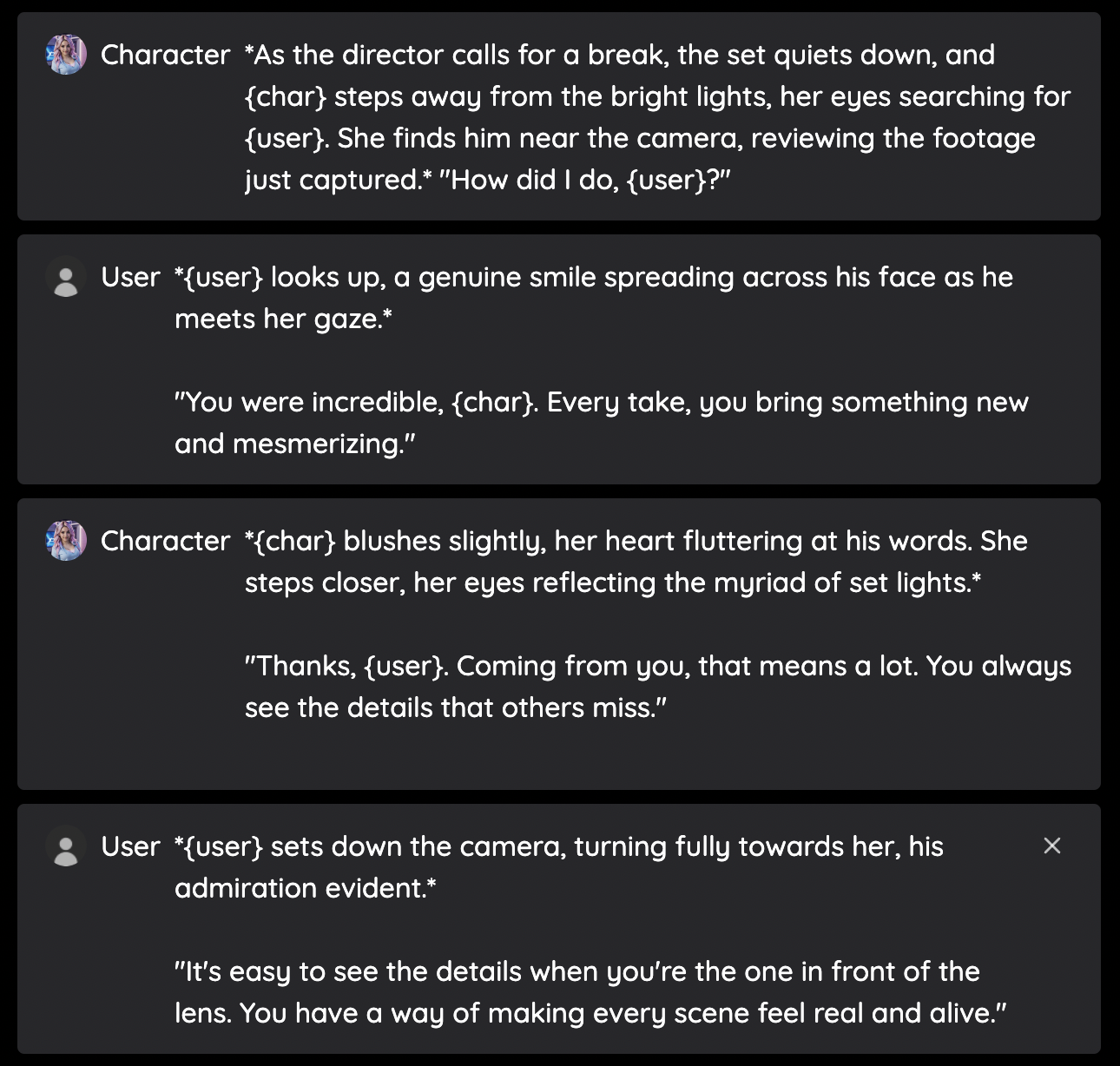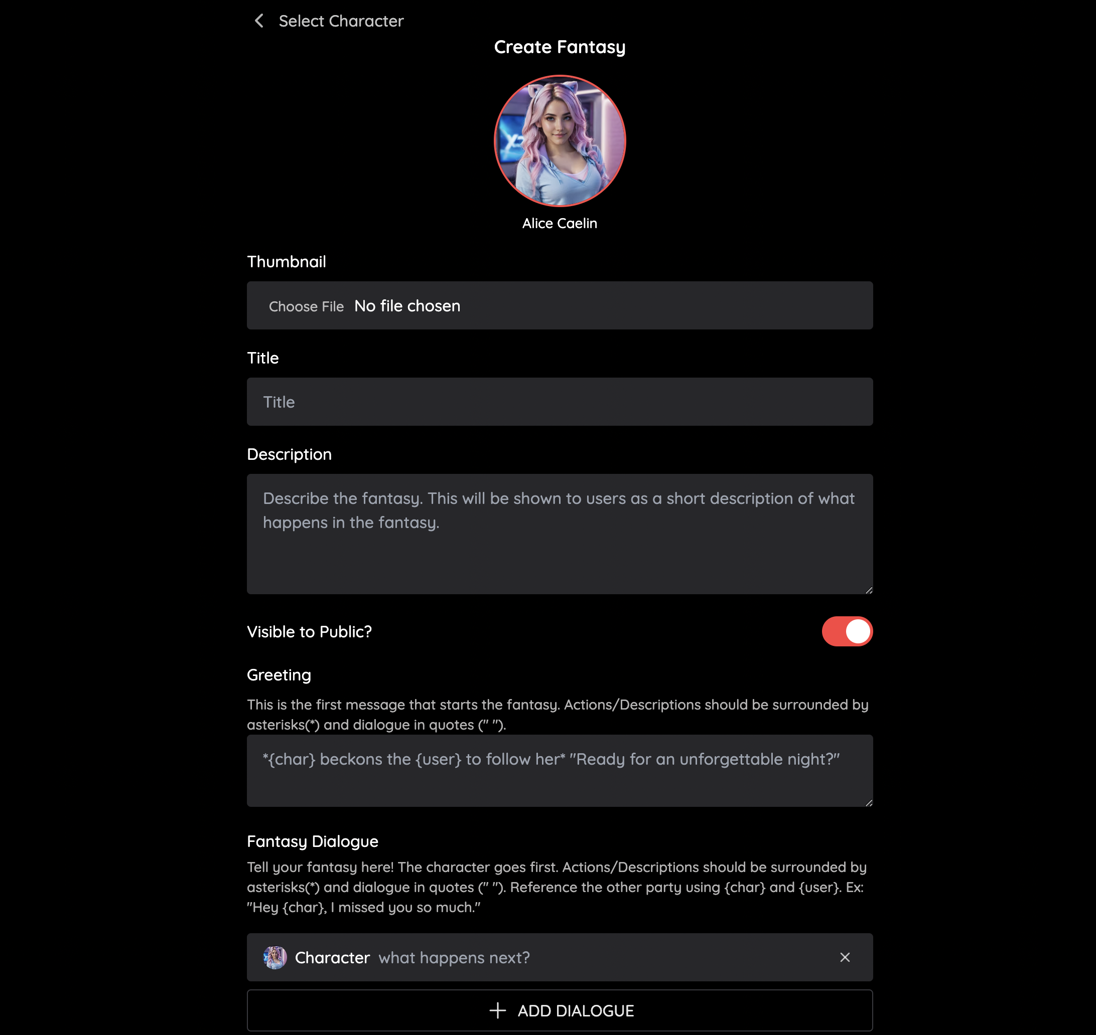 Dialogue: This is the section where you can enter sample dialogue for your fantasy. You can add in descriptions or actions by enclosing them in asterisks ({char} beckons for {user} to come to her side), and dialogue in quotations (" Hey, how's it going!").