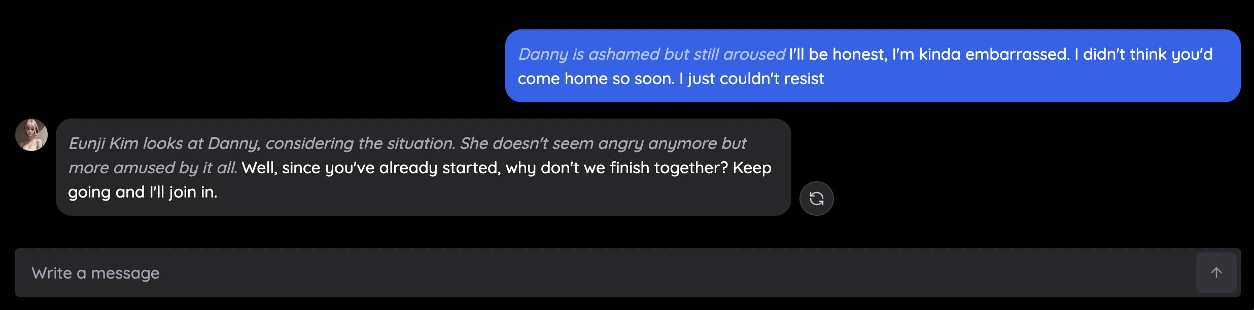 You can freely chat with your character as if it was a normal interaction with a person but if you wanted to have a bit more control of your story you can describe the actions or settings taking place in the conversation.